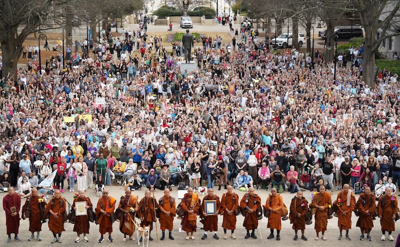 The monks set out on October 26 from the Huong Dao Vipassana Meditation Center in Fort Worth, Texas, accompanied by their faithful rescue dog Aloka, a Pali word meaning “Light.” Their walk of 110 days would cover 2,300 miles and take them through eight southern states. Their destination was Washington D.C., which they aimed to reach by February 10. Initially, the Walk drew little attention apart from the folks they passed along their route. However, as word of the Walk spread via social media, the numbers of people coming to see them both in person and online rose exponentially.